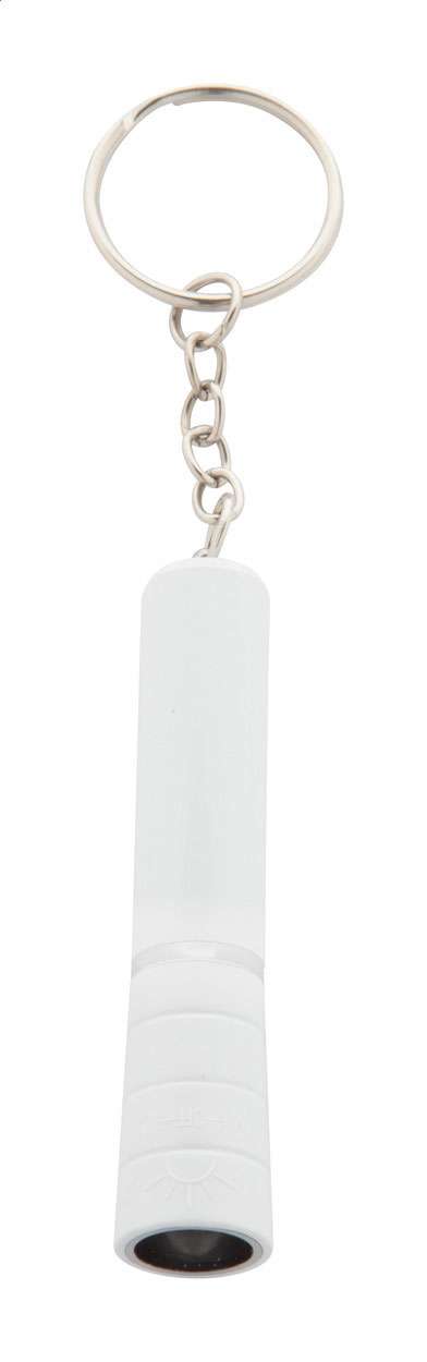 Mini torcia in plastica con 1 LED e portachiavi in metallo. Fornita di batteria a bottone.