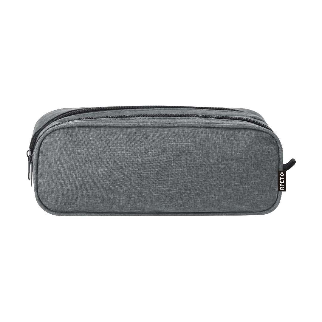 Astuccio realizzato in morbido poliestere riciclato RPET 300D con tessuto effetto mélange. Presenta due scomparti e chiusura a cerniera con cursori in metallo. Include logo RPET sull’etichetta esterna.