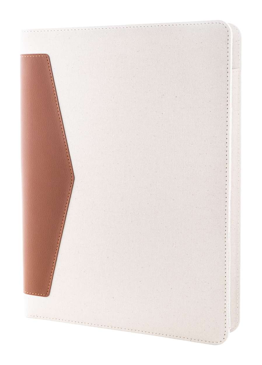 Cartella portadocumenti formato A4 in canvas riciclato e pelle PU riciclata, molteplici scomparti interni e blocco note da 20 fogli in carta riciclata a righe. Materiale: 70% cotone riciclato e 30% poliestere RPET.