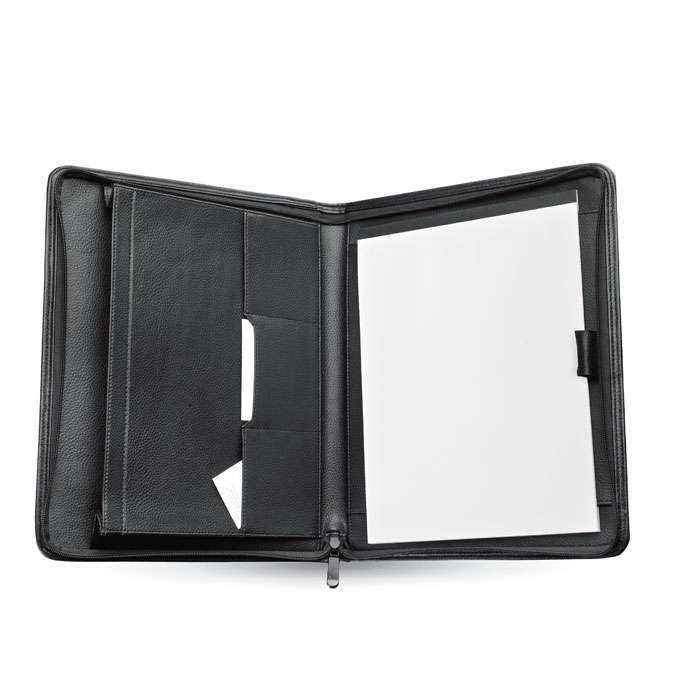 Blocco A4 con copertina in pelle rigenerata. Cerniera. Blocco note da 25 fogli, 4 scomparti interni. Porta penna.