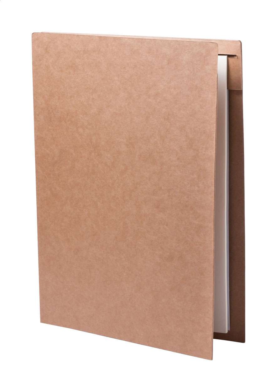 Cartella porta documenti in carta riciclata con blocco note da 20 fogli bianchi e penna a sfera con refill blu.