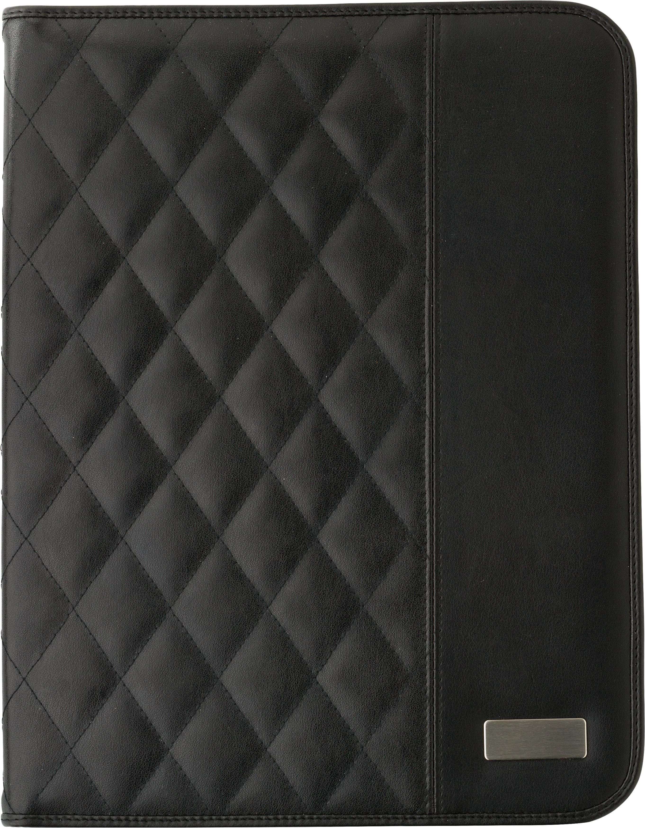Portablocco formato +/- A4 con targhetta in metallo personalizzabile ad incisione laser, vano porta carta di credito, passante elasticizzato per penna, blocco con pagine a righe, PU imbottito