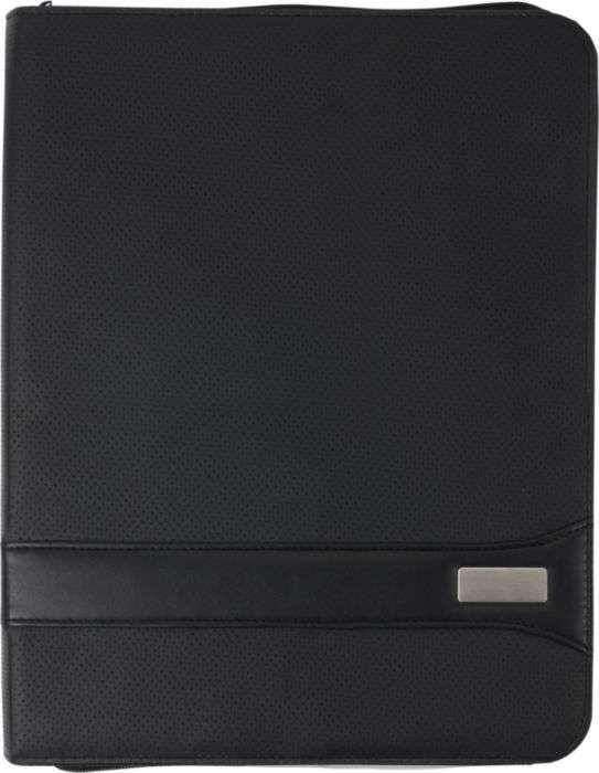 Portablocco formato +/- A4, 2 scomparti grandi interni, 4 vani porta carte di credito, passante elasticizzato per penna, blocco a righe, targhetta in metallo 4x,15 cm applicata sul fronte personalizzabile ad incisione laser, chiusura lampo, in PVC