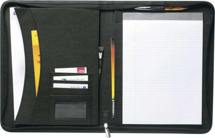 Portablocco formato +/- A4, chiusura a lampo, targhetta in metallo, blocco da 30 pagine a righe incluso, passante per penna (non inclusa), vari scoparti, chiusura lampo, in similpelle
