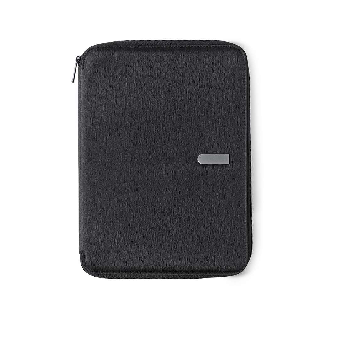 Elegante portadocumenti con chiusura a zip in morbida microfibra. Interno con blocco removibile da 20 fogli a riga, tasca con cerniera, tasca con patta, portacarte e portapenne. Con elegante targhetta metallica sul fronte per la stampa laser.