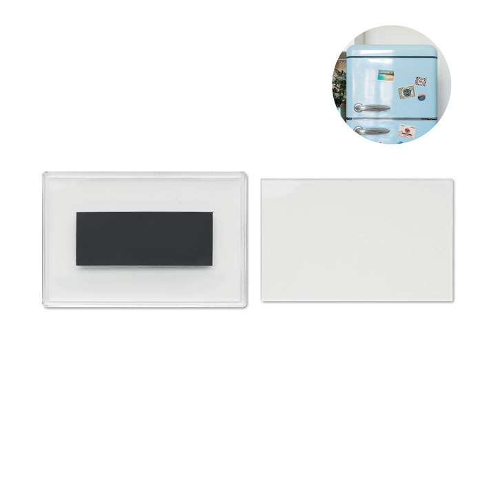 Portafoto rettangolare in acrilico con magnete. Adatto a foto inlay di dimensioni 8,8 x 5,6 cm. Ideale come souvenir o per immortalare ricordi di famiglia sul frigorifero.