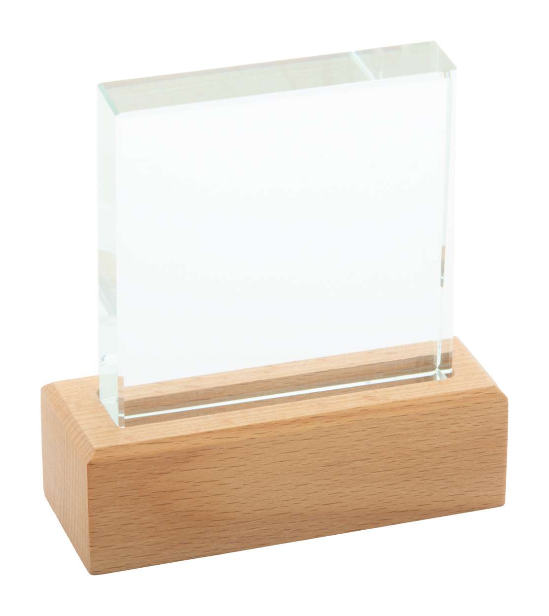 Trofeo in vetro con base in legno di faggio, completo di confezione regalo in cartoncino kraft.