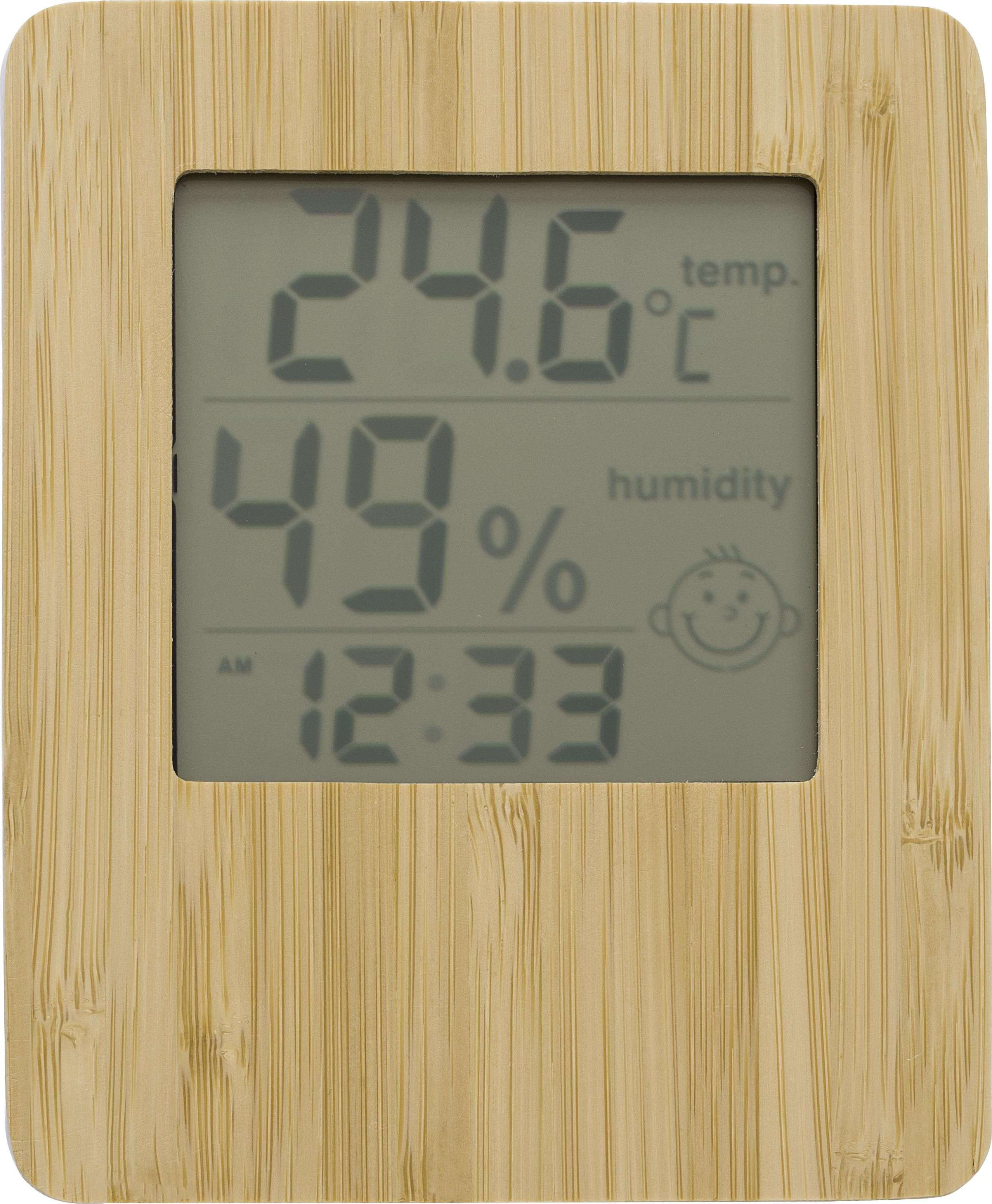 Stazione meteorologica in bamboo e ABS, supporto pieghevole, include funzioni come l'ora, anno, temperatura, umidità, batterie incluse