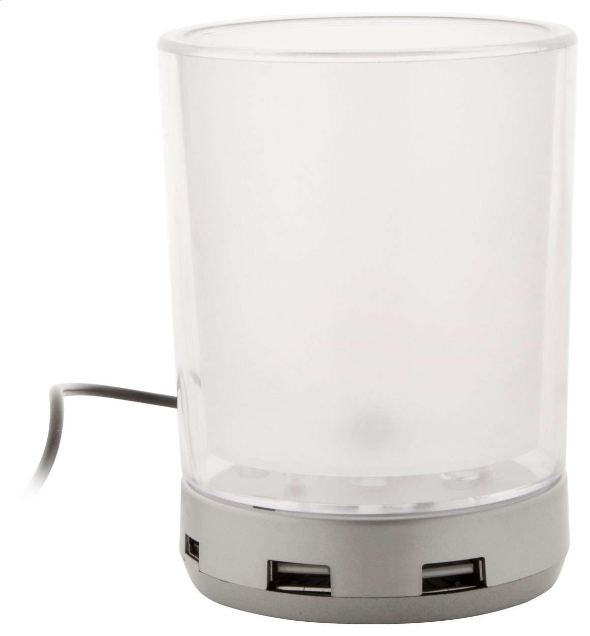 Portapenne da tavolo con HUB USB 4 porte con luce azzurra alla connessione. USB 2.0. Materiale: ABS. Grafica personalizzata.