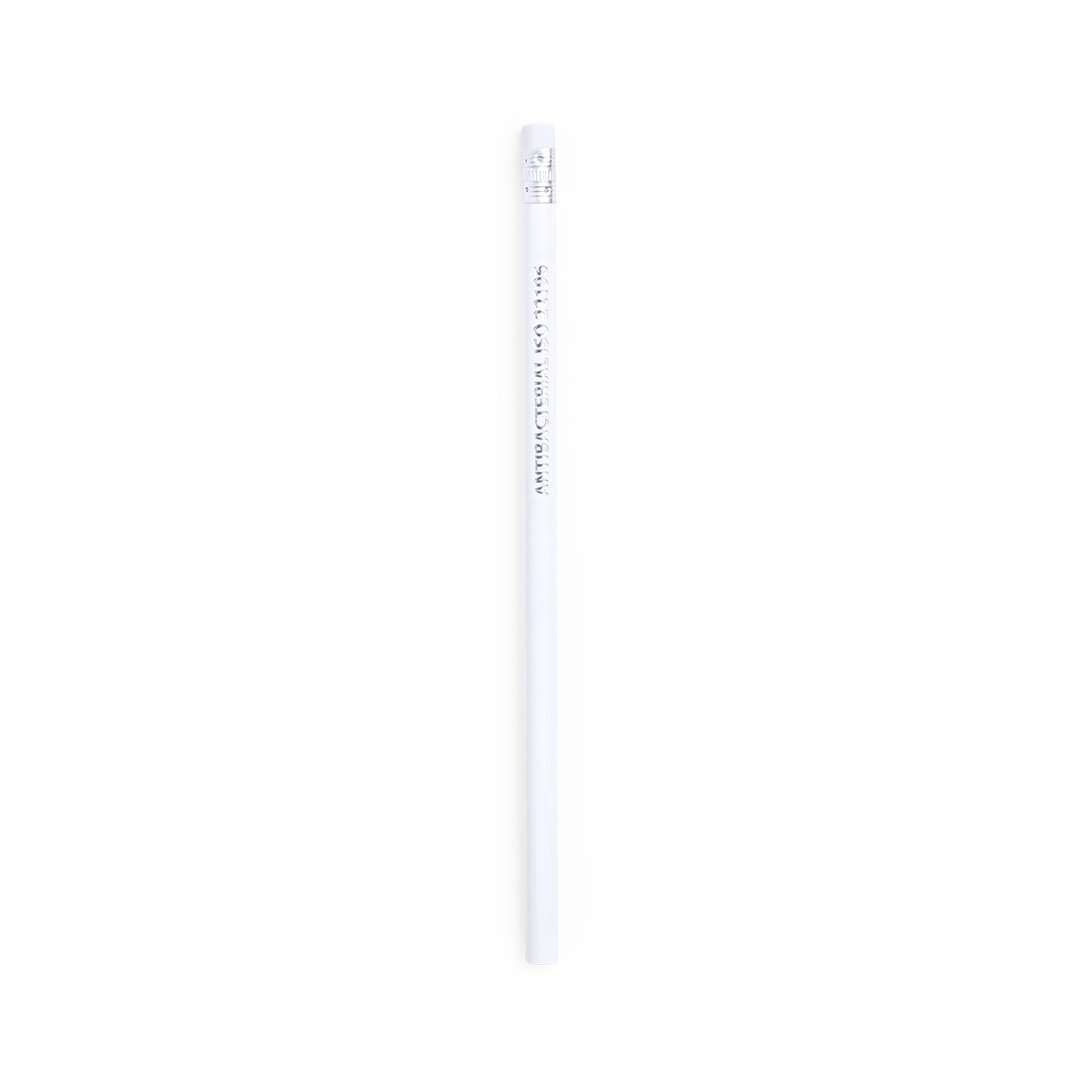 Matita in legno con corpo rotondo e rivestimento antibatterico. Disponibile in bianco, con gomma. Punta non affilata.I prodotti con trattamenti antibatterici sono in grado di ridurre drasticamente le cariche batteriche presenti sulle superfici dei materiali, grazie all'utililzzo di agenti microbici statici permanenti, ad alta efficacia nell'inibire e prevenire la contaminazione batterica.Articolo conforme agli standard ISO 22196, che determina l´attività antibatterica nei materiali plastici e nelle superfici non porose e di conoscere l´efficacia dell'inibizione microbica che gli additivi hanno sugli oggetti trattati attraverso una valutazione quantitativa