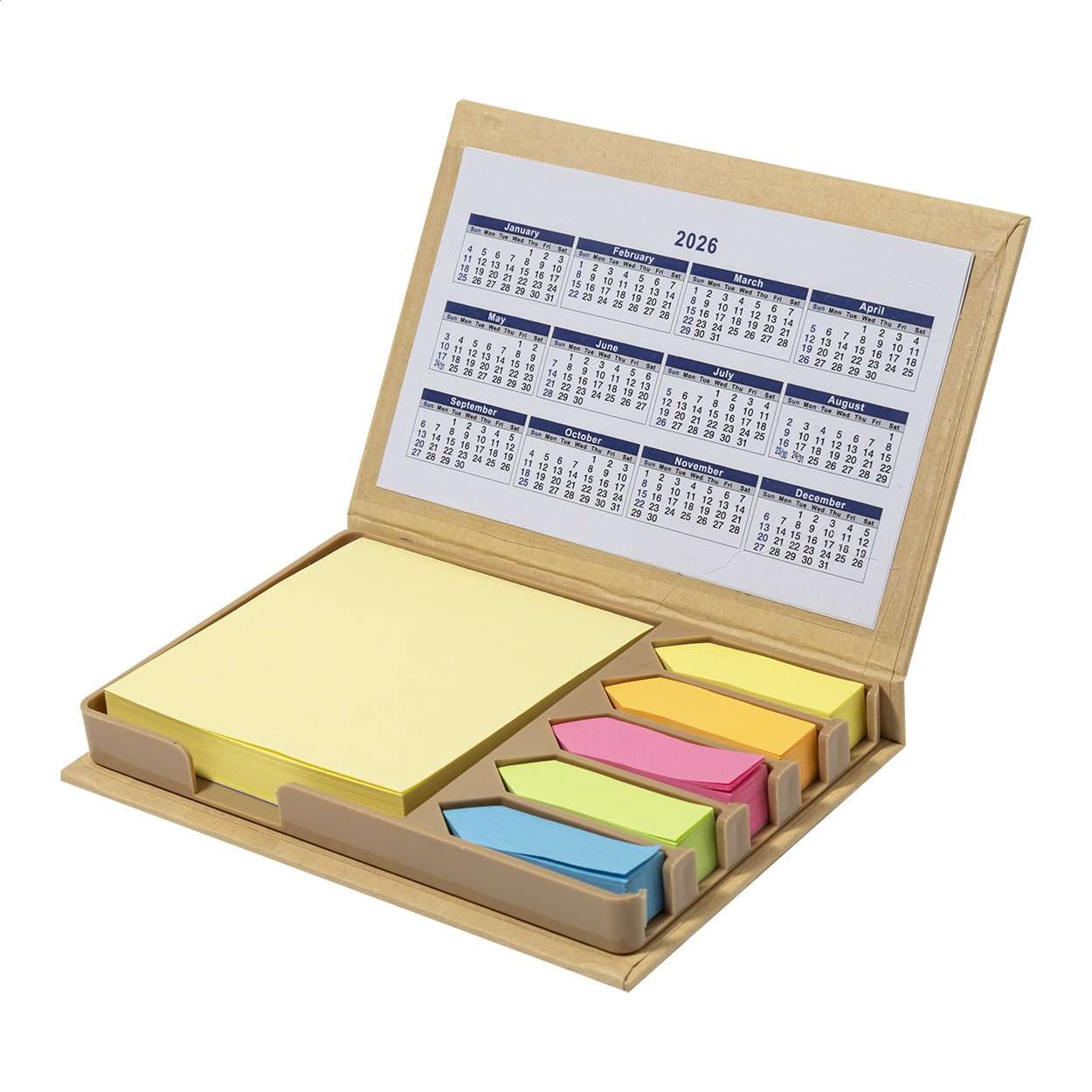Blocco da 100 foglietti adesivi in carta gialla riciclata e 500 segna pagine (in 5 colori). Completo di calendario quadriennale all'interno del coperchio.