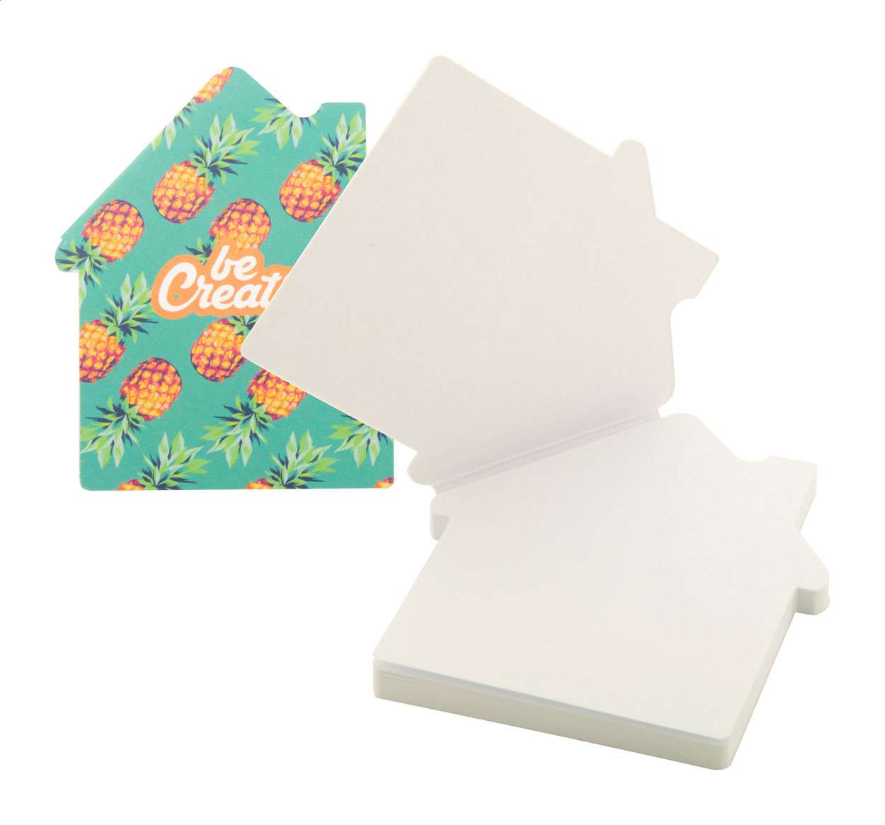 Blocco di 50 foglietti adesivi a forma di casa con copertina in cartoncino. Il costo comprende la stampa a colori della copertina esterna. MOQ: 100 pezzi.