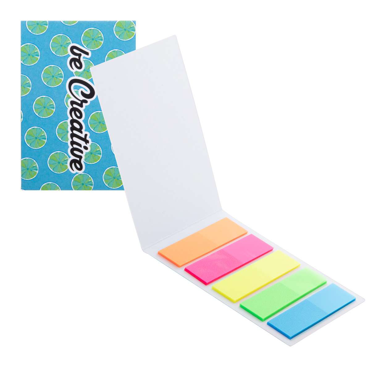 Segnapagina personalizzabile con copertina in carta. Comprende 100 segnapagina in pellicola di plastica disponibile in 5 colori assortiti (44x12 mm). Il prezzo include la stampa a colori sull'esterno della copertina. MOQ: 100 pezzi.