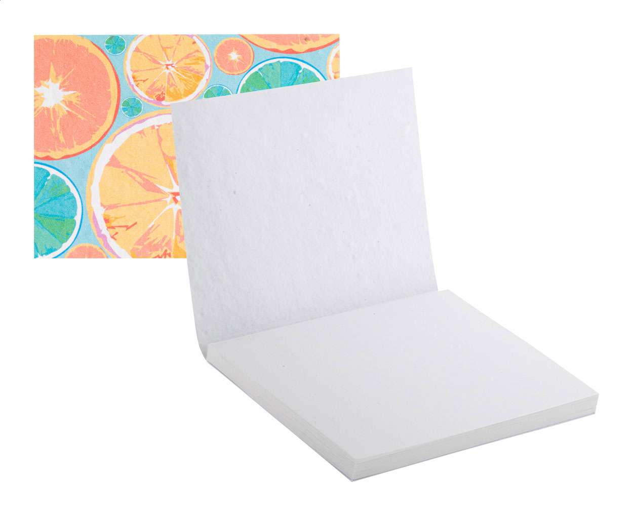 Blocco per appunti personalizzabile, con copertina in carta di semi di fiori selvatici assortiti. Include 50 foglietti adesivi in carta riciclata (100×75 mm). Il costo comprende la stampa a colori della copertina esterna. MOQ: 100 pezzi.