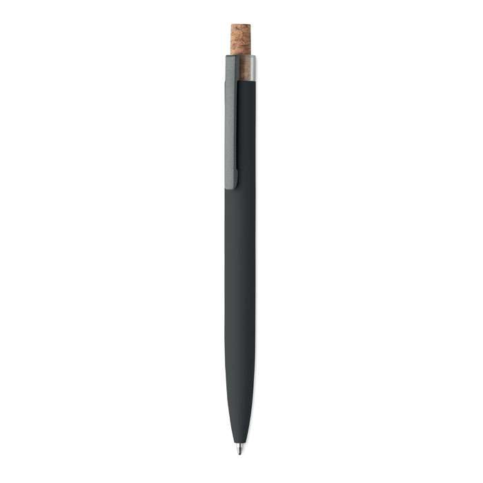 Penna a sfera in alluminio riciclato con pulsante in sughero e clip in metallo. Inchiostro blu.