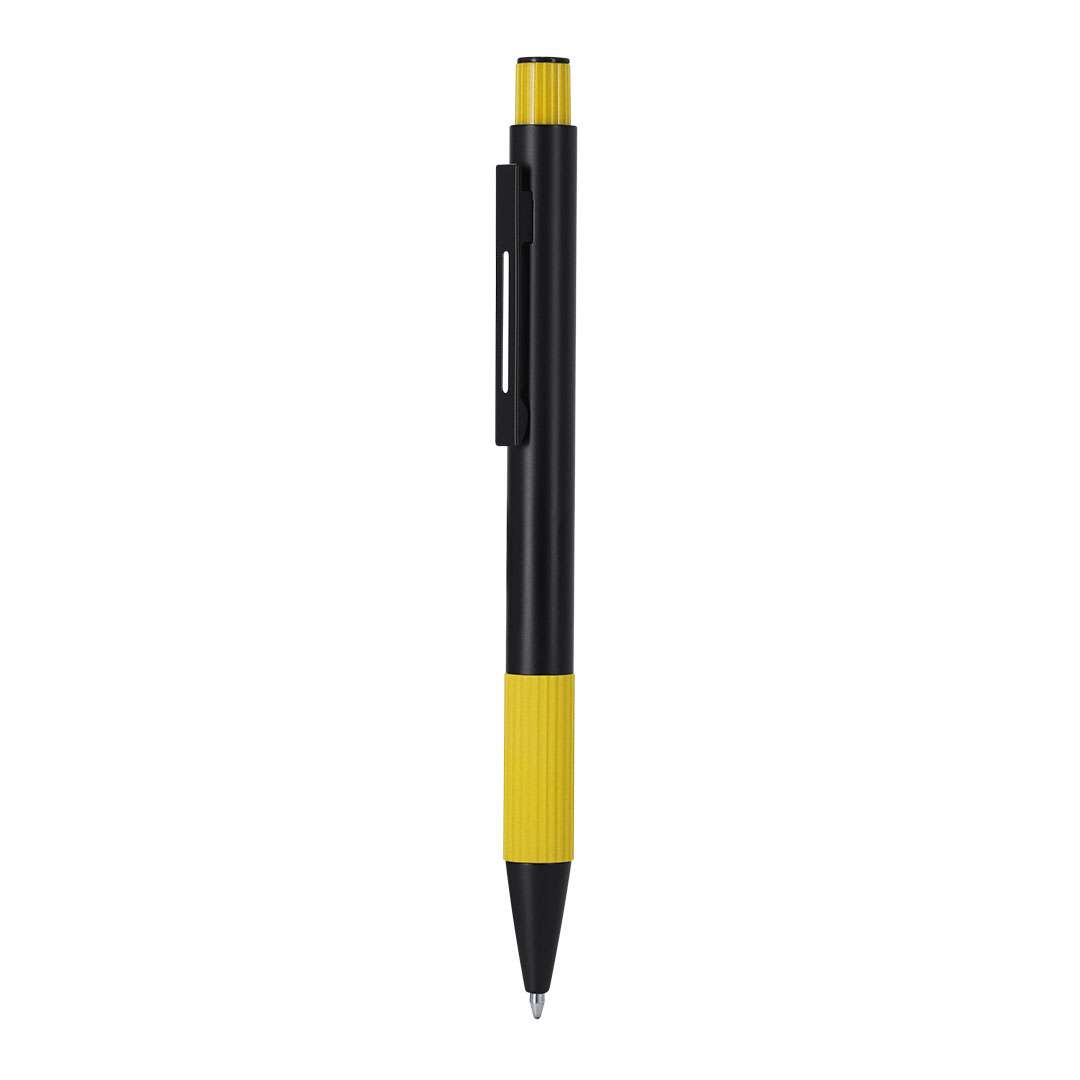 Penna con corpo in alluminio riciclato. Manico con finitura gommosa e texture. Meccanismo a pulsante, cartuccia gigante e inchiostro blu. Include il distintivo in alluminio riciclato.