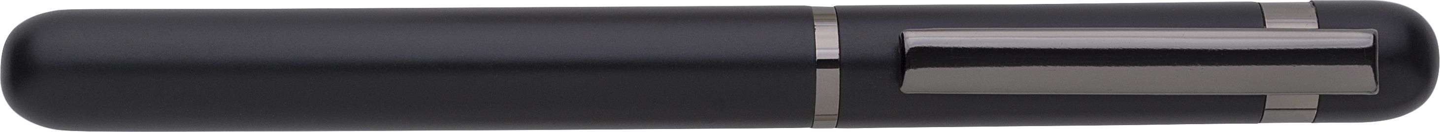 Penna rollerball in alluminio e ottone, dettagli lucidi sulla clip, anello, meccanismo a tasto, confezione regalo magnetica singola in carta, refill blu