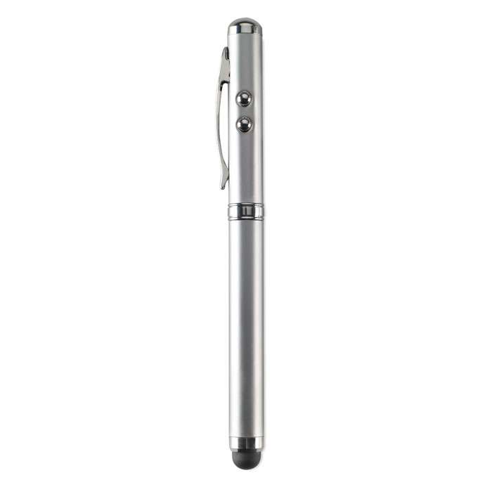 Puntatore laser in metallo con punta touch. Led bianco, puntatore rosso. 3 batterie bottone incluse. Confezionato in scatola di latta.