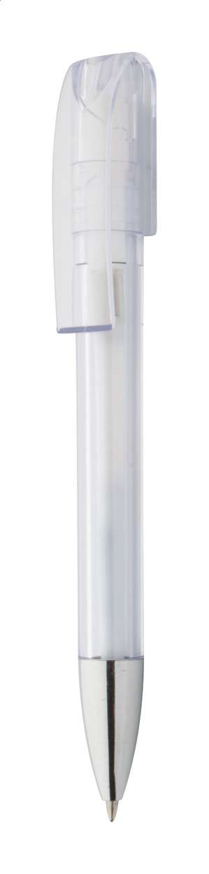 Penna a sfera in plastica di colore trasparente, con puntale cromato e refill blu.