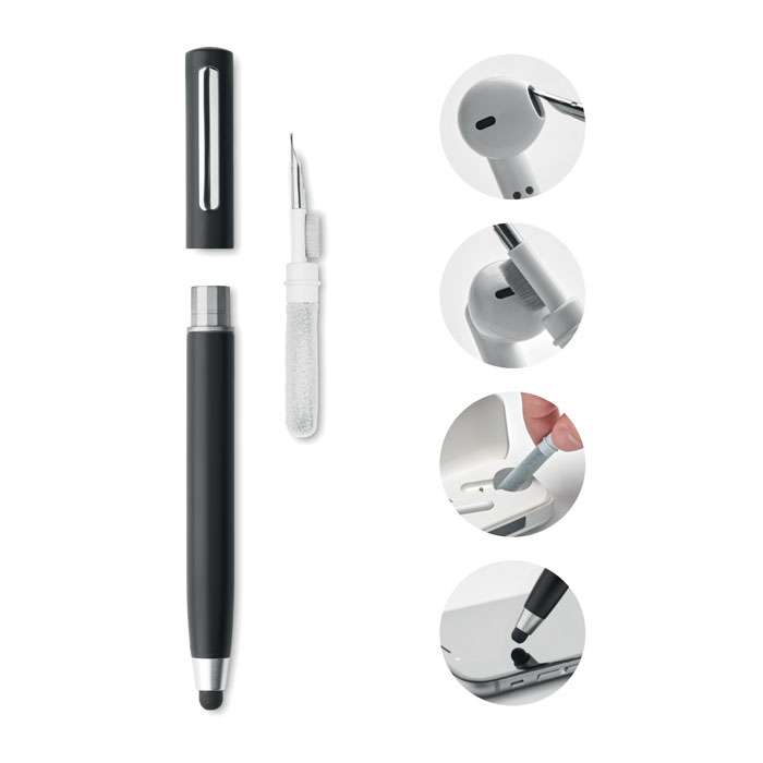 Penna a sfera a rotazione con stilo in ABS. Dispone di un kit per la pulizia degli auricolari TWS: pinza metallica, spugna e pennello. Inchiostro blu.
