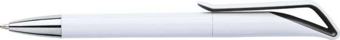 Penna a sfera geometrica in ABS, corpo bianco, finiture colorate, meccanismo a rotazione, puntale argentato, refill blu