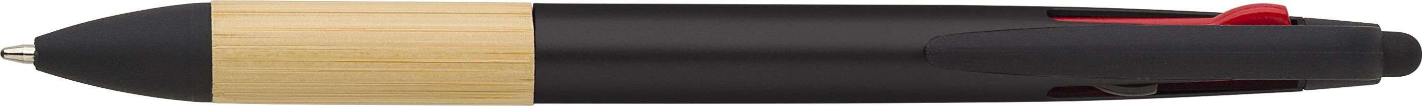 Penna a sfera in ABS 3 colori, impugnatura in bambù, punta stilo, refill rosso, blue e nero