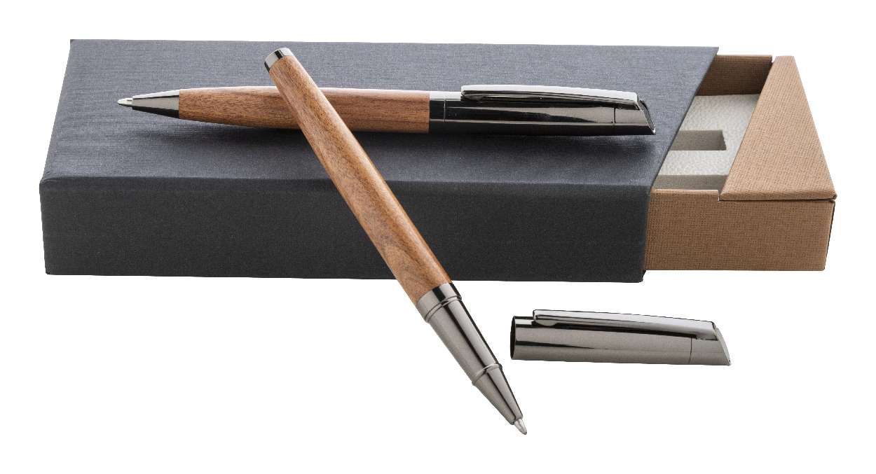 Elegante set composto da una penna a sfera e da una penna roller in metallo con fusto in legno, dettagli in metallo lucido e refill blu. Set fornito in scatola regalo bicolore. Prodotto a marchio André Philippe.