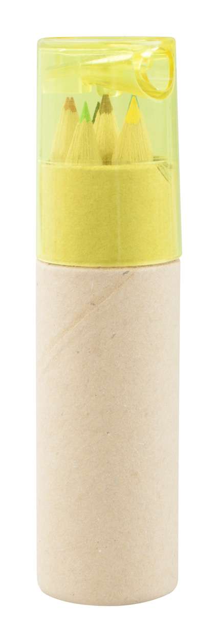 Set 6 matite colorate in confezione cilindrica di cartoncino con temperino in plastica.