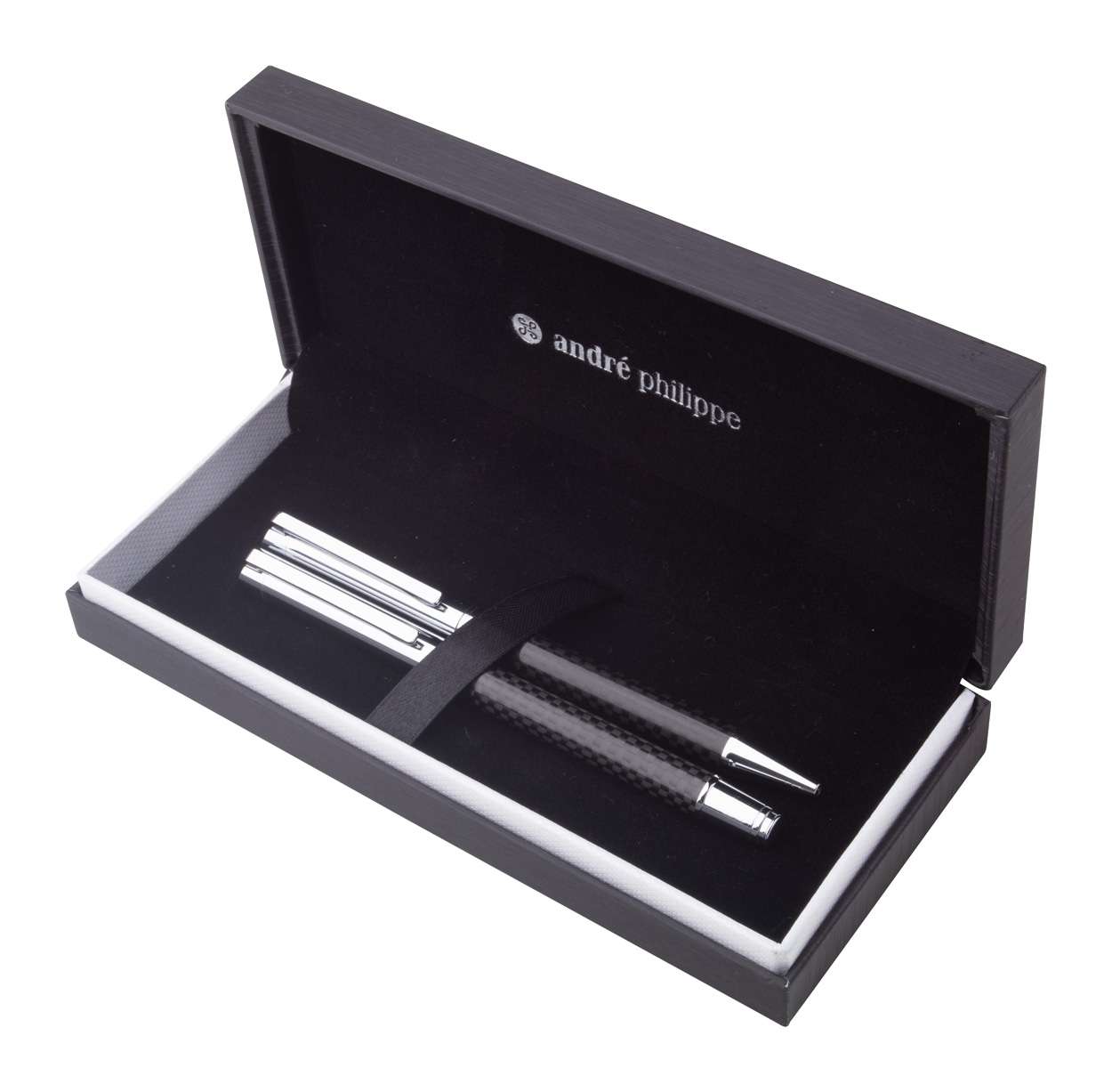 Elegante set composto da una penna a sfera ed una penna roller in metallo, fusto con finitura simil carbonio e parti cromate lucide. In confezione regalo nera e refill blu. Prodotto a marchio André Philippe.
