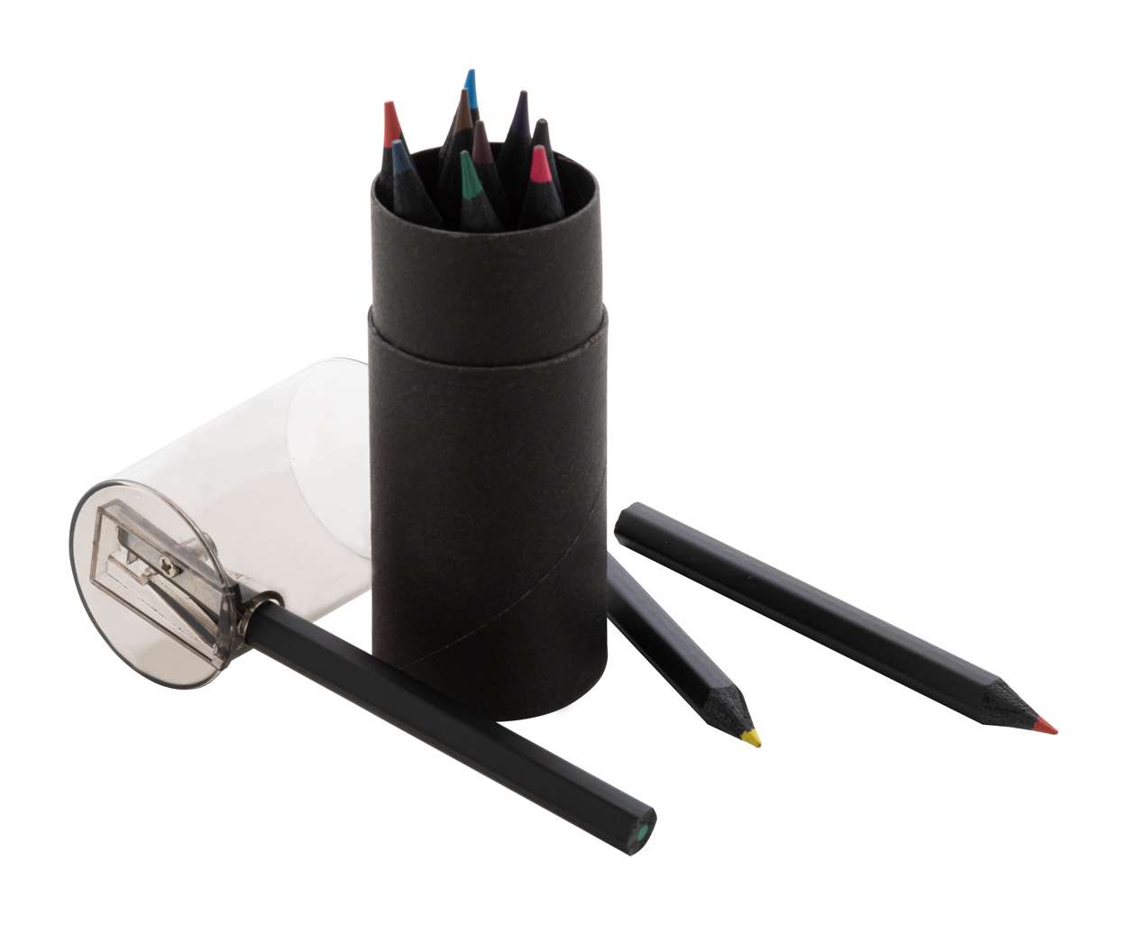 Set di 12 matite in legno nero contenute in un astuccio di cartoncino nero e temperamatite in plastica.