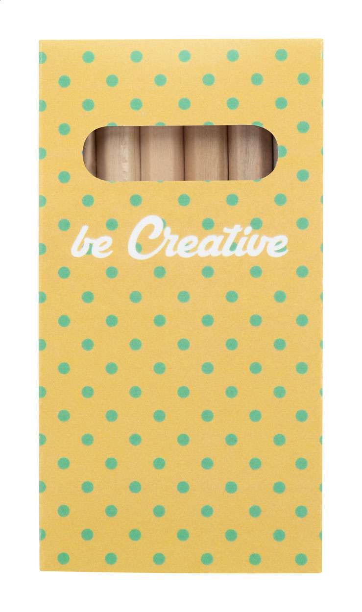 Set 6 matite colorate in legno, in confezione di cartoncino totalmente personalizzabile. Il costo comprende la personalizzazione con stampa digitale. MOQ: 100pz.
