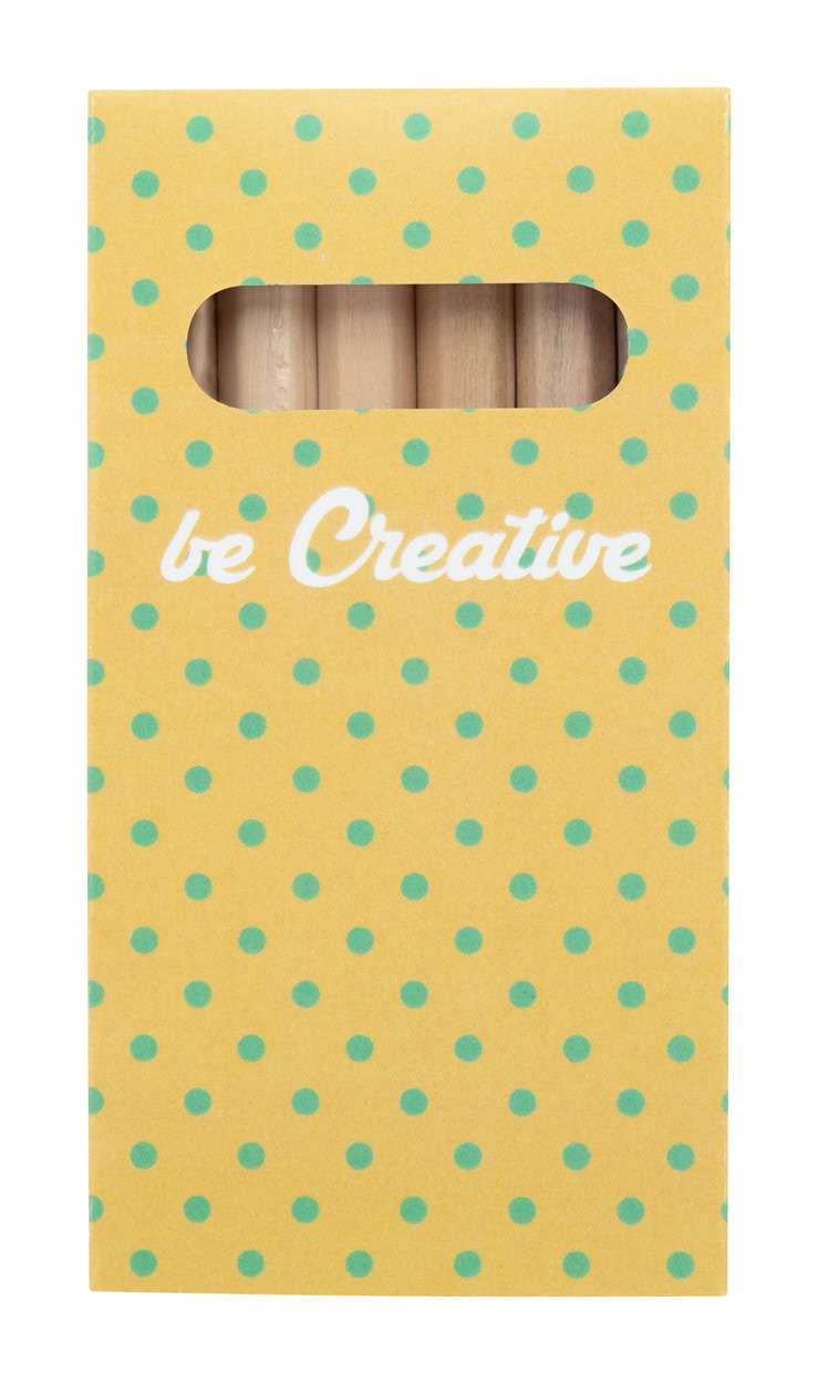 Set 6 matite colorate in legno, in confezione di cartoncino totalmente personalizzabile. Il costo comprende la personalizzazione con stampa digitale. MOQ: 100pz.