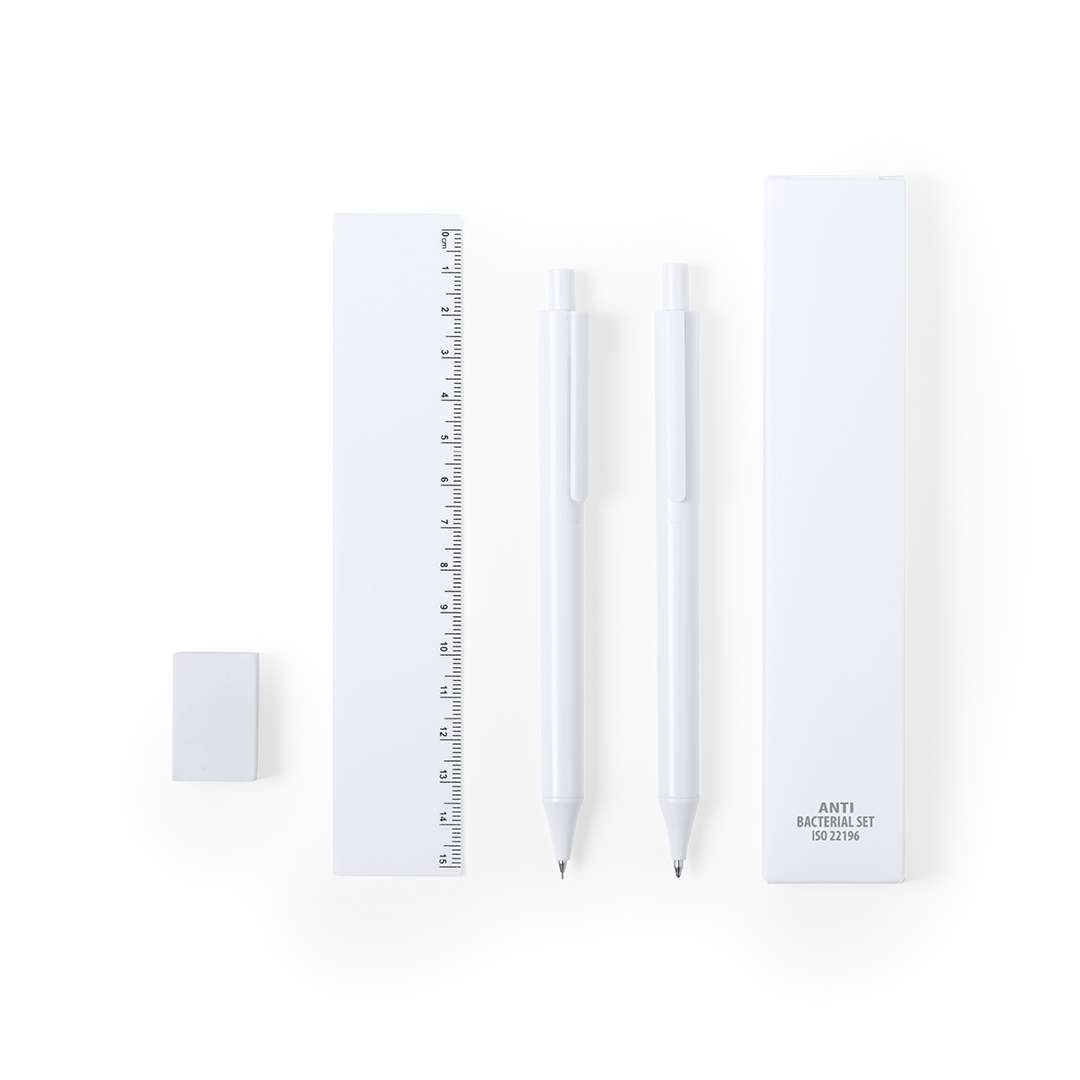 Set antibatterico in resistente materiale PP bianco. Include penna a sfera, matita meccanica (Mina da 0,5 mm inclusa), righello da 15 cm e gomma.I prodotti con trattamento antibatterico sono in grado di ridurre drasticamente la carica batterica presente sulla superficie dei materiali, grazie alla presenza di agenti microbici statici permanenti, con elevata efficacia nell'inibire e prevenire la contaminazione batterica.Articolo rispondente agli standard ISO 22196, che determina l'attività antibatterica nei materiali plastici e nelle superfici non porose e di conoscere l'efficacia dell'inibizione microbica che gli additivi hanno sugli oggetti trattati attraverso una valutazione quantitativa