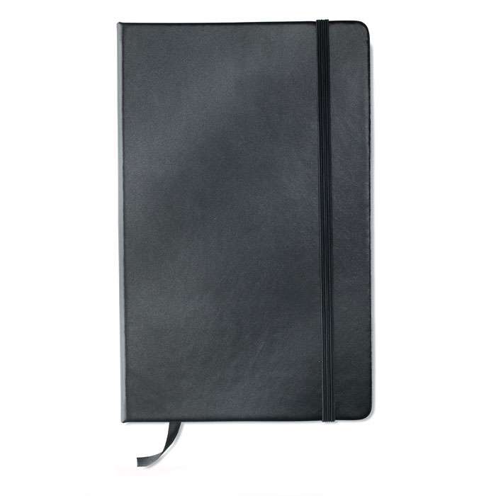 Notebook A5 con copertina rigida in PU. 192 pagine a righe in carta riciclata (96 fogli). Chiusura con elastico in tono e nastro segnapagina.
