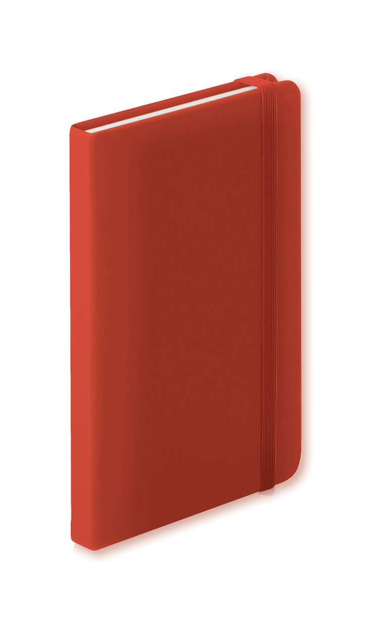 Quaderno con rivestimento in finta pelle, 100 fogli a righe, segnalibro e cinturino in gomma coordinati. Formato A6.