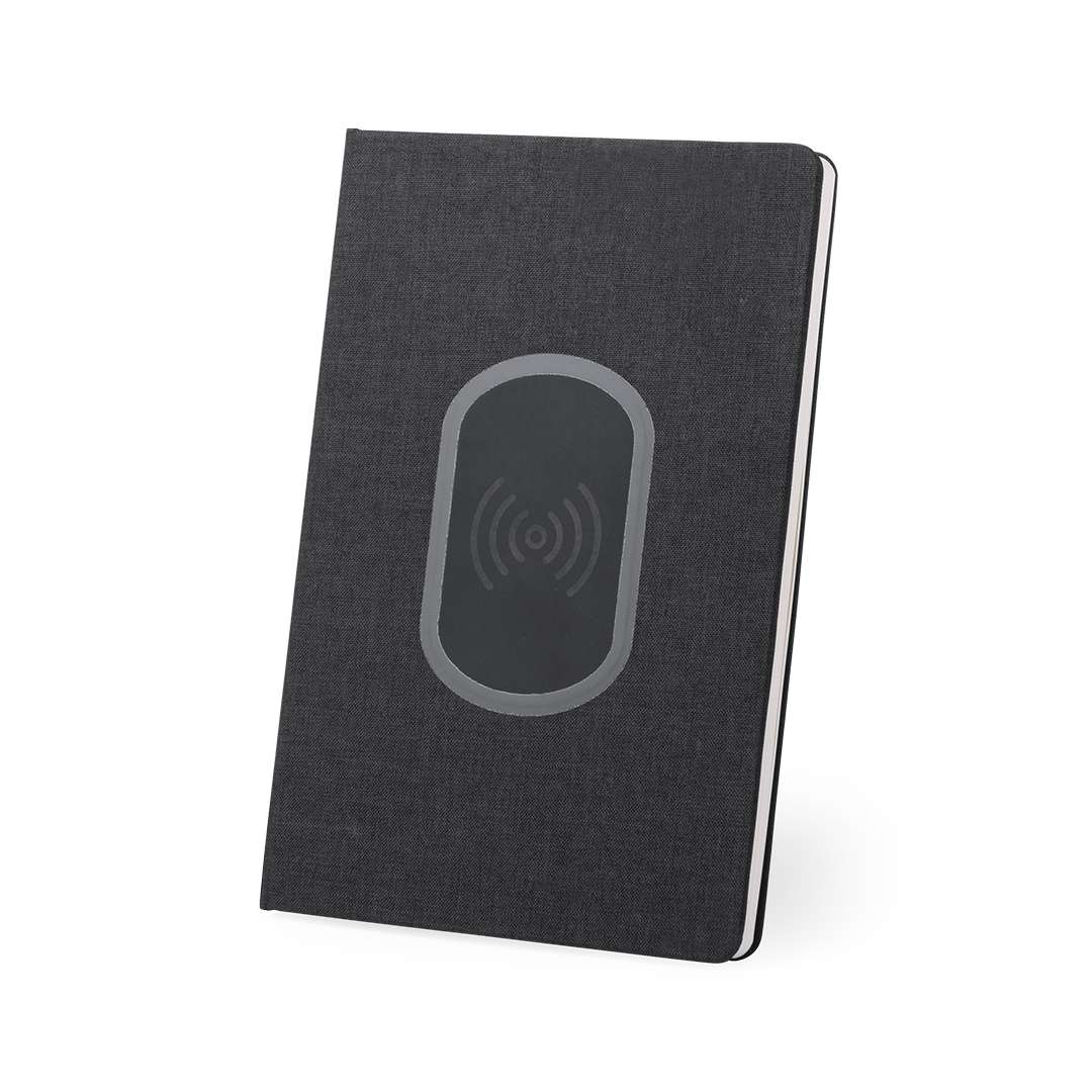 Block Notes di ricarica in resistente poliestere 300D con caricatore wireless integrato. Con un design sobrio e un'originale stazione di ricarica sulla copertina. Include 80 fogli con layout a riga.