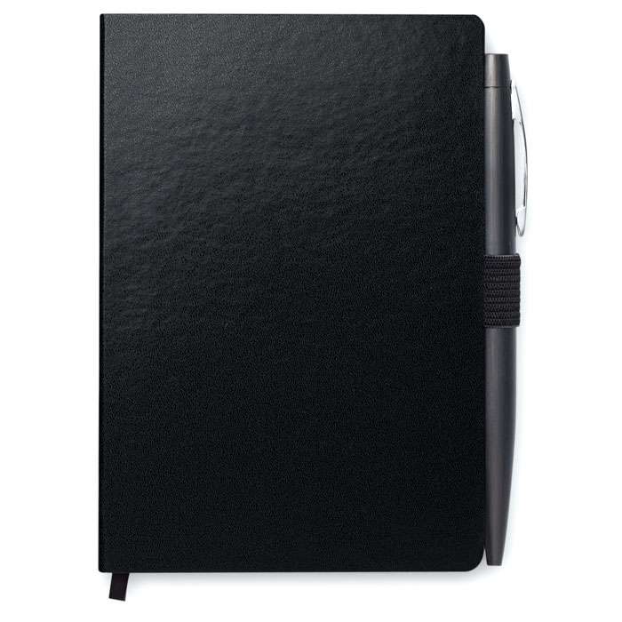 Notebook A6 con penna. Copertura rigida in PU. 144 pagine a righe (72 fogli). Cinturino di chiusura elastico e portapenne abbinati. Penna a sfera a bottone in metallo abbinata. Inchiostro blu. FSC MIX CREDIT | P7.1 | FSC-C213206