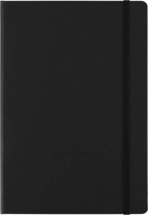 Taccuino colorato in PVC, formato +/- A5, elastico e segnalibro in tinta, 128 pagine a righe, scomparto all'interno della copertina, logo IMPRESSION sul retro