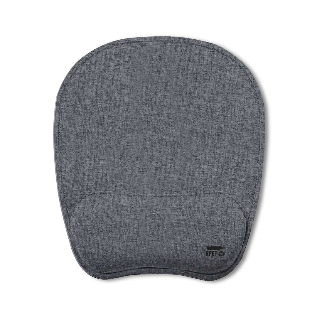 Tappetino mouse in morbido poliestere RPET, realizzato con plastica riciclata per incoraggiare il riutilizzo dei rifiuti di plastica e aiutare la sostenibilità del pianeta. Con base in silicone antiscivolo e poggiapolsi imbottito per prevenire stress e dolori articolari. Etichetta RPET stampata.